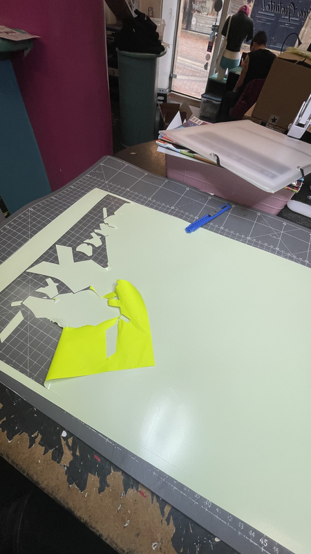 Pour le flex, il y a une machine de découpe qui transforme des rouleaux de flex en formes ou lettres selon le projet du client. Après la découpe, le surplus de flex est retiré manuellement avec un cutter, ce qu’on appelle l’échenillage. Ensuite, le motif découpé est prêt à être pressé sur le vêtement à l’aide d’une presse à chaud. Cette technique est souvent utilisée pour des lettres, des logos simples ou des designs colorés.